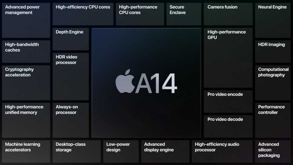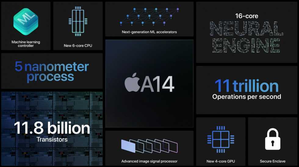 Внутри процессора A14 Bionic работает 16-ядерный нейропроцессор Neural Engine, способный выполнять 11 триллионов операций в секунду. Благодаря этому улучшенному нейропроцессору машинное обучение стало почти вдвое быстрее по сравнению с предыдущим поколением. Кроме того, центральный процессор оптимизирован ускорителями машинного обучения второго поколения, впервые установленными на iPad. Это позволяет ускорять часто используемое при машинном обучении умножение матриц в 10 раз по сравнению с предыдущим iPad Air.