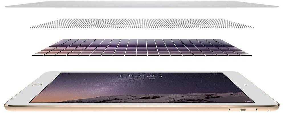 При этом гаджет второго поколения оснащён сенсорным дисплеем совершенно другого уровня. При его разработке была применена технология полного ламинирования экрана. Разработчикам удалось убрать воздушную прослойку между стеклом и матрицей. Это сделало устройство тоньше и привело к тому, что изображение в iPad Air 2 визуально словно лежит на поверхности стекла. Устройство, выпущенное ранее, не имеет подобных визуальных эффектов. Ещё одним преимуществом девайса iPad Air второго поколения стало надёжное антибликовое покрытие, которое обеспечило комфортную работу с гаджетом в условиях яркой освещённости.