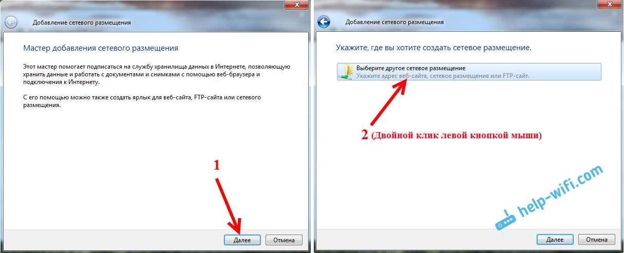 Откроется еще одно окно, в котором нажимаем «Далее». В следующем окне нажмите два раза на пункт «Выберите другое сетевое размещение».