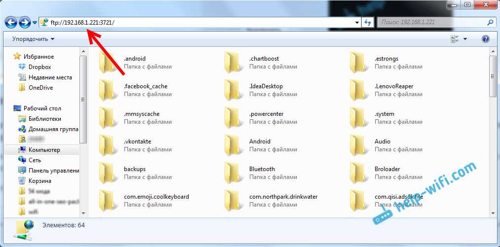 , и в адресной строке вводим адрес, который появился в программе «ES Проводник» на мобильном устройстве. У меня это «ftp://192.168.1.221:3721/». У вас скорее всего будет другой адрес.