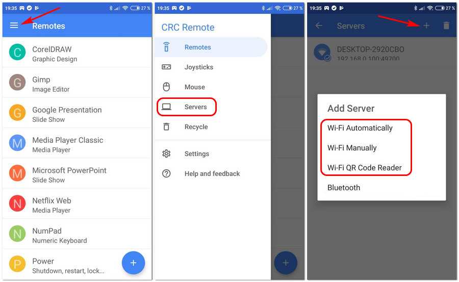 Если автоматическое подключение не произошло, в меню приложения открываем раздел «Servers» и добавляем компьютер повторно с помощью опции «Wi-Fi Automatically» для автоматического подключения. Либо же используем опцию «Wi-Fi Manually» для ручного ввода IP-адреса компьютера. Также можем использовать опцию «Wi-Fi QR Code Reader» и считать QR-код подключения на экране компьютера – в программе CRC Remote, в разделе «Home».