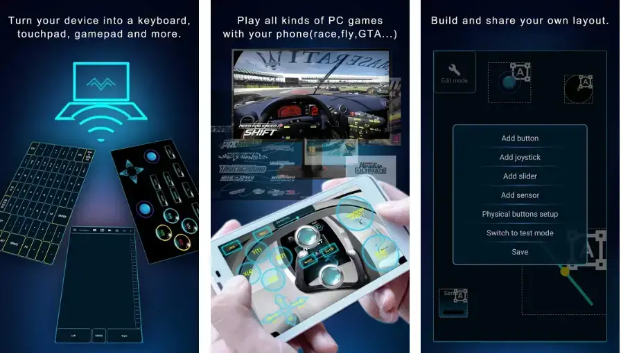 Monect lets you use your phone as a remote mouse and keyboard, be it over Bluetooth, Wifi, or USB. It even lets you use the phone’s sensors (gyro, accelerometer, etc.) and offers specialized button controls for gaming.