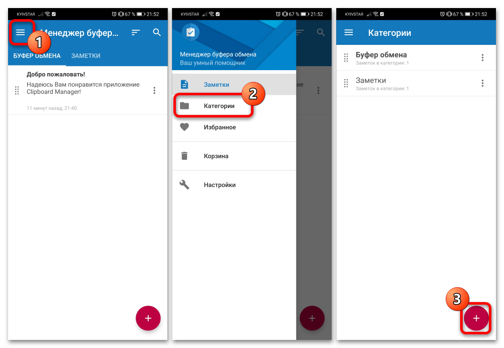 Далее перед вами появится главный экран – он поделен на категории «Буфер обмена» и «Заметки». Основное отличие между ними – текст в первой будет очищаться автоматически, тогда как сохранённый во второй остаётся там до тех пор, пока вы не захотите удалить его самостоятельно.