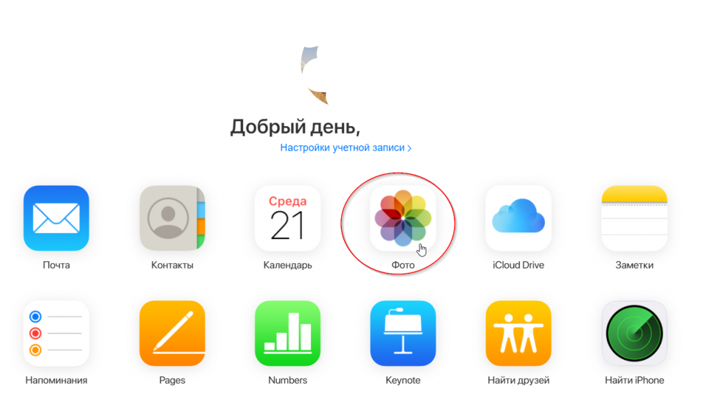Переходим на сайт iCloud.com, вводим свой ID и пароль. Здесь, среди всех предложенных вариантов, выбираем «Фото».