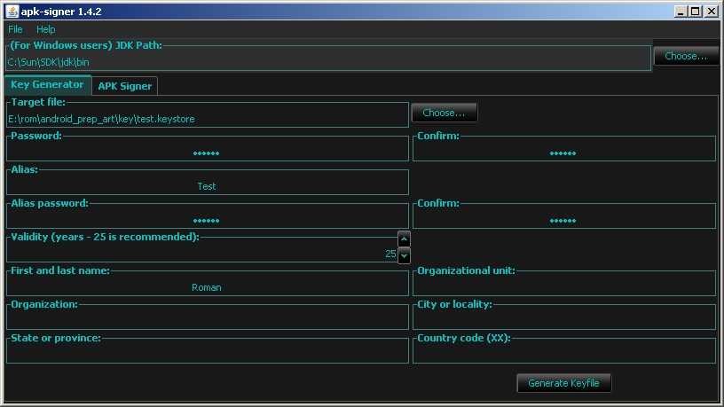 В каталоге com.kauf.particle.virtualtorch/build/ появится результирующий APK-файл. Однако установить его не получится, так как он не имеет цифровой подписи и контрольных сумм файлов (в нем просто нет каталога META-INF/). Мы должны подписать пакет с помощью утилиты apk-signer. Запустили. Интерфейс состоит из двух вкладок — на первой (Key Generator) создаем ключи, на второй (APK Signer) подписываем. Чтобы создать наш приватный ключ, заполняем следующие поля: