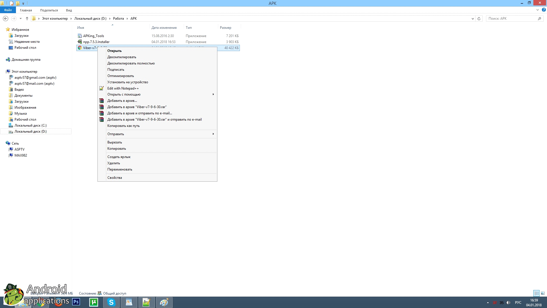 Теперь рассмотрим внутреннюю структуру более подробно для этого нам понадобиться программа для декомпиляции, Java и АПК-файл. Основным инструментом для разборки.apk является Apktool, но данная программа работает только со строки, что не очень удобно. Для более быстрого и удобного разбора можно использовать APKing, это все та же Apktool, но с возможностью работы из контекстного меню.И так устанавливаем APKing как любое приложение для Windows и выбрав.apk нажимаем на него правой клавишей мыши и одновременно Shift, после чего увидим следующее: