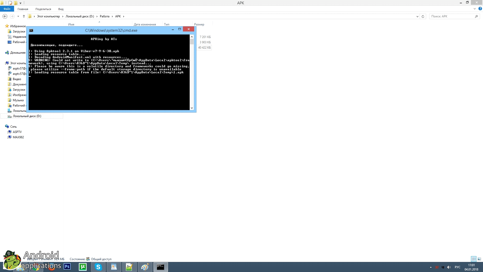 Декомпиляция apk может быть выполнена с помощью утилиты apktool. bat файл для её запуска Вы можете скачать внизу статьи. Самую последнюю версию утилиты можно взять на сайте авторов.