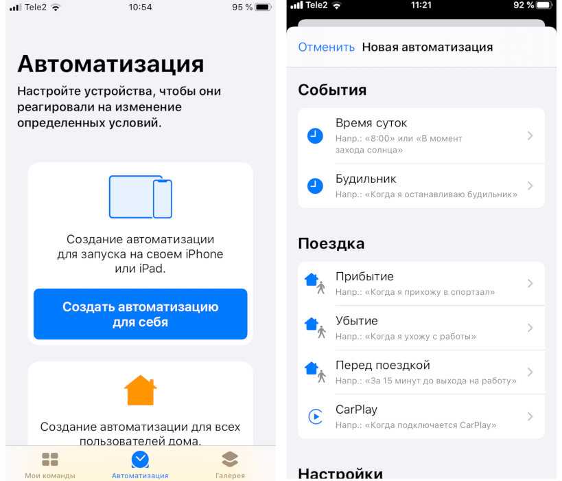 Вкладка «Автоматизация» в нижней части окна «Команд» позволяет привязать выполнение команды к определенному условию. Например, запланировать на выбранное время (наконец-то в iOS появился аналог cron и «Планировщика задач», внедренного парнями из Microsoft еще в Windows 98). Но существуют и менее очевидные триггеры: прибытие в какую-то географическую точку по данным GPS или убытие из нее, переключение режима работы телефона или запуск программы. Например, можно настроить автоматическое выполнение команды при выходе из дома, приезде на работу или в момент, когда айфон переключается в режим пониженного энергопотребления.