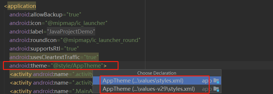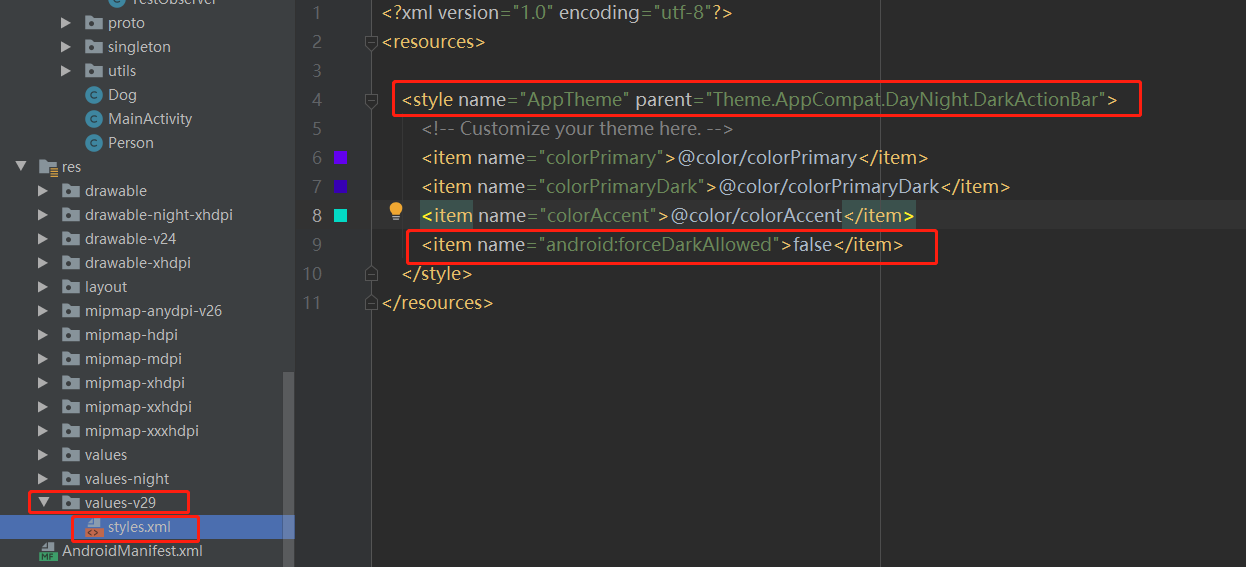 В это время в настройках системы переключите систему в темный режим, тогда текущее приложение будет использовать тему AppTheme в файле styles.xml в папке values-29.