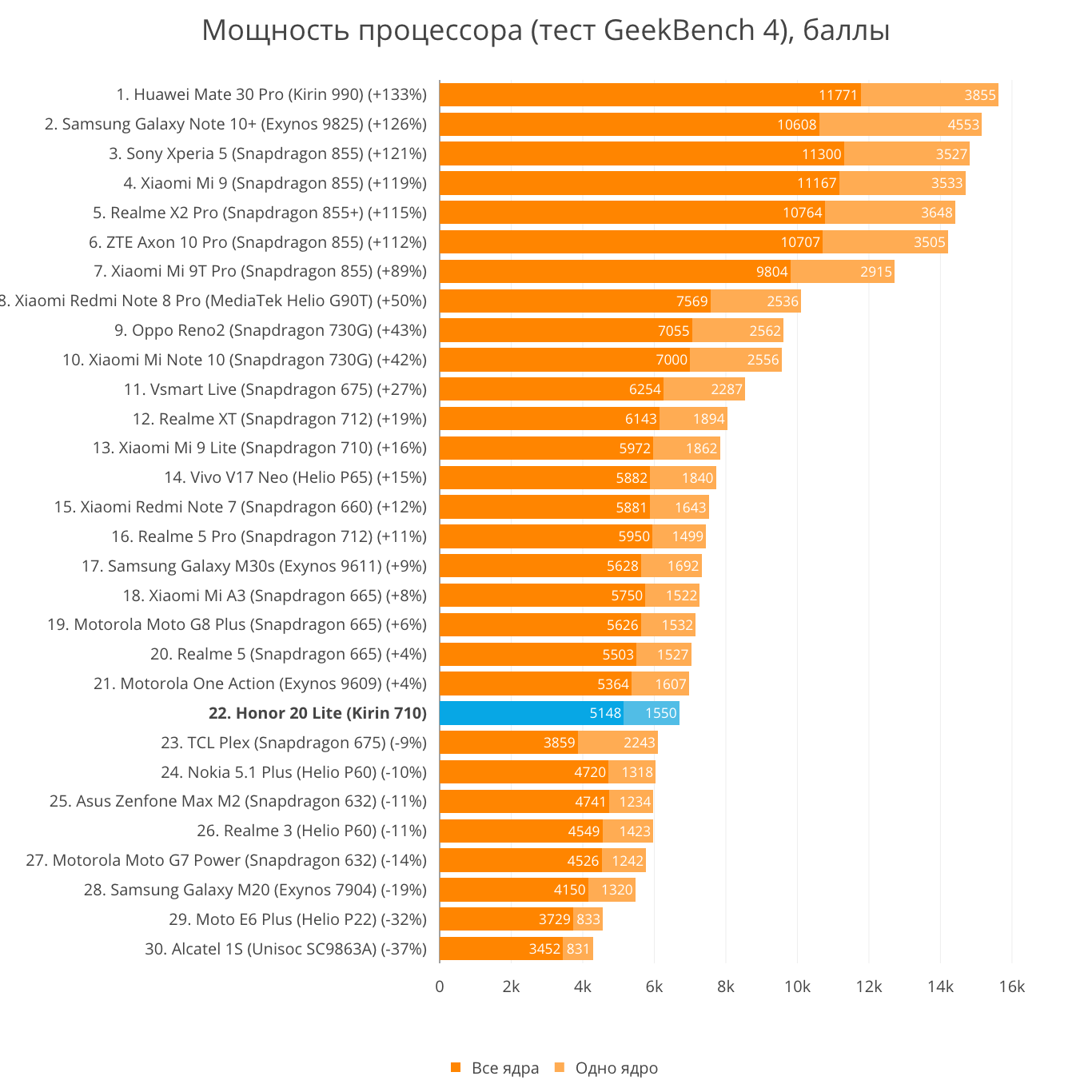 | 11 | Huawei Honor 20 Lite | Kirin 710 | 4 Gb + 128 Gb | 138500 |