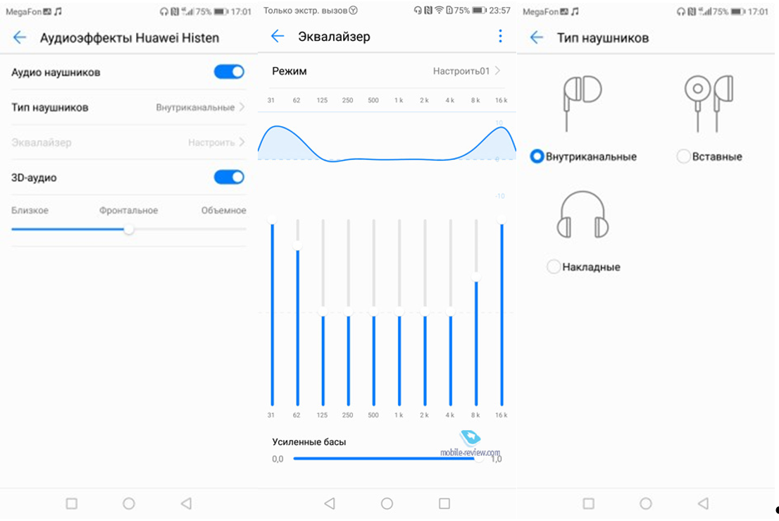 Звуковые возможности Honor 9 Lite, как и у флагмана, расширены фирменными алгоритмами Huawei Histen, при этом, доступ к звуковым эффектам открывается только при подключенных наушниках. В настройках «Звука» предлагается выбрать тип подключаемого аудио-аксессуара. Отказавшись от включения режима 3D-аудио (близкое, фронтальное, объемное) можно воспользоваться 10-полосным эквалайзером с усилением басов, пятью пресетами и индивидуальной настройкой.