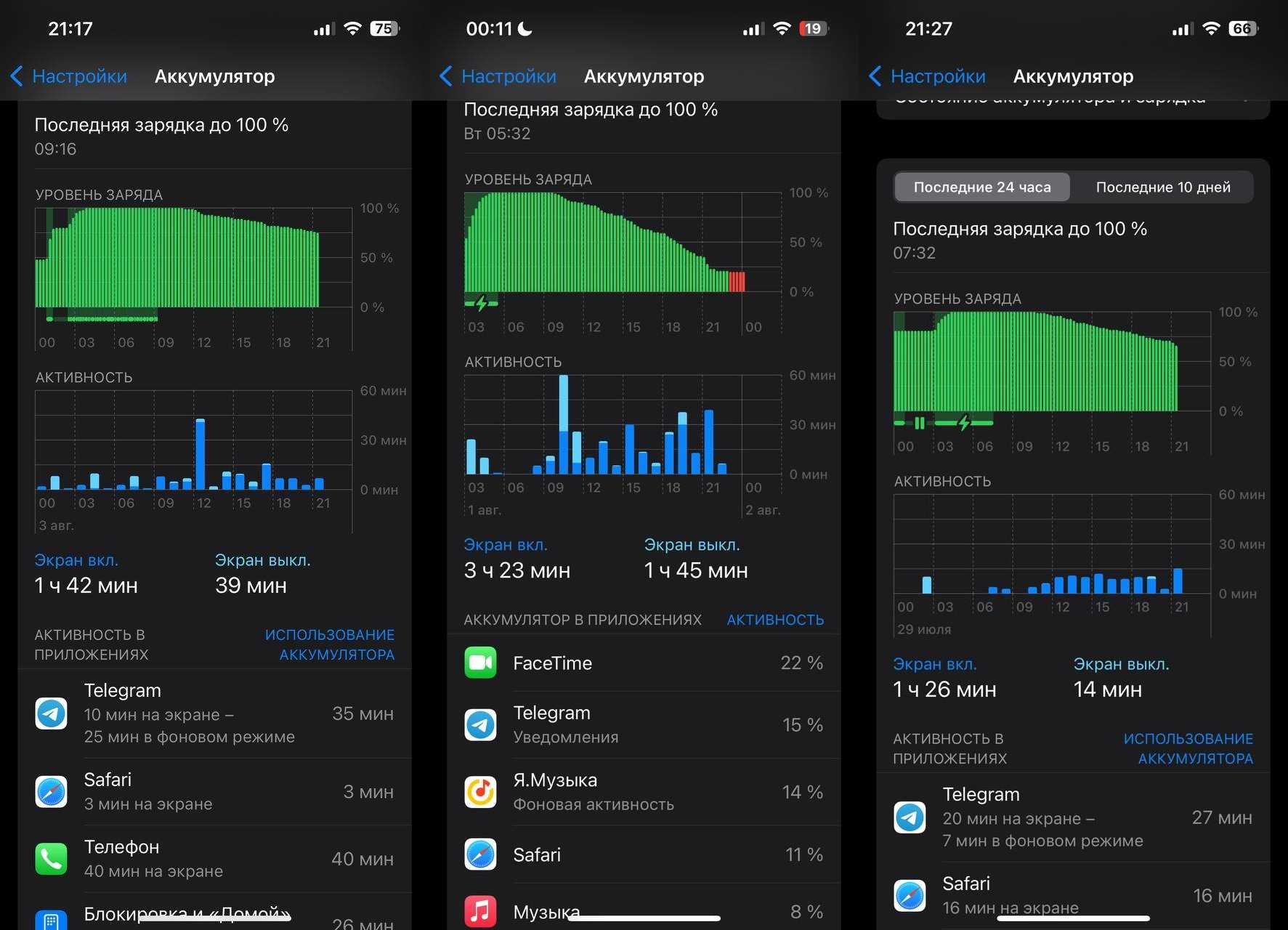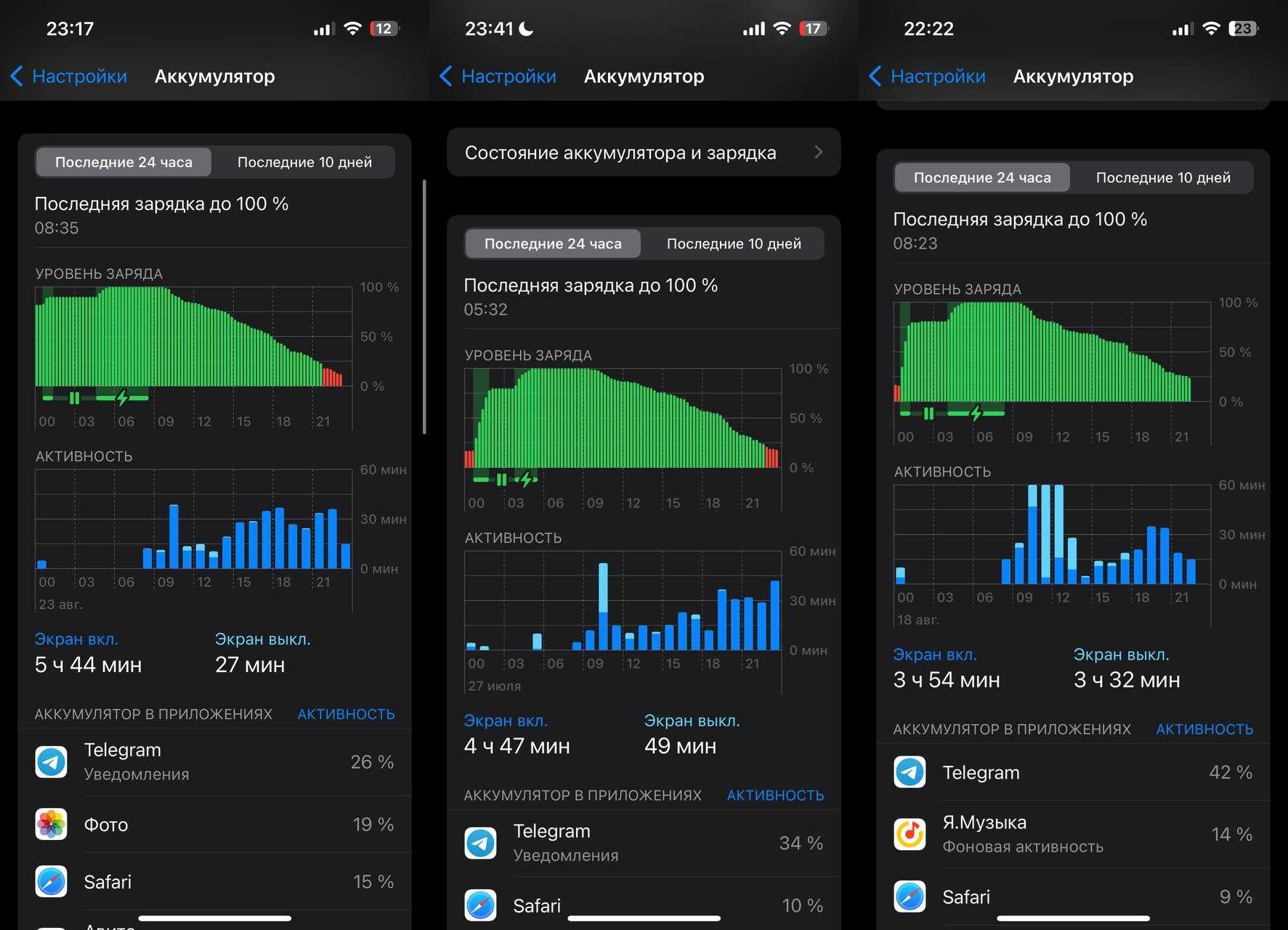 Порой у меня складывается впечатление, что я обитаю в параллельной вселенной. Вокруг одни восторженные отзывы о времени работы новых айфонов, но у меня совсем иные ощущения. Чаще всего, конечно, телефон доживает до вечера, но это дни, когда айфоном особо и не пользуешься. Зато как только начинается более-менее интенсивная нагрузка, ситуация меняется не в лучшую сторону. В среднем у меня выходит около 5-5,5 часов экранного времени, что в принципе немного по меркам 2023 года. К примеру, относительно простые смартфоны на Android за 20 000 — 25 000 рублей выдают 7-8 часов экранного времени при схожей нагрузке.