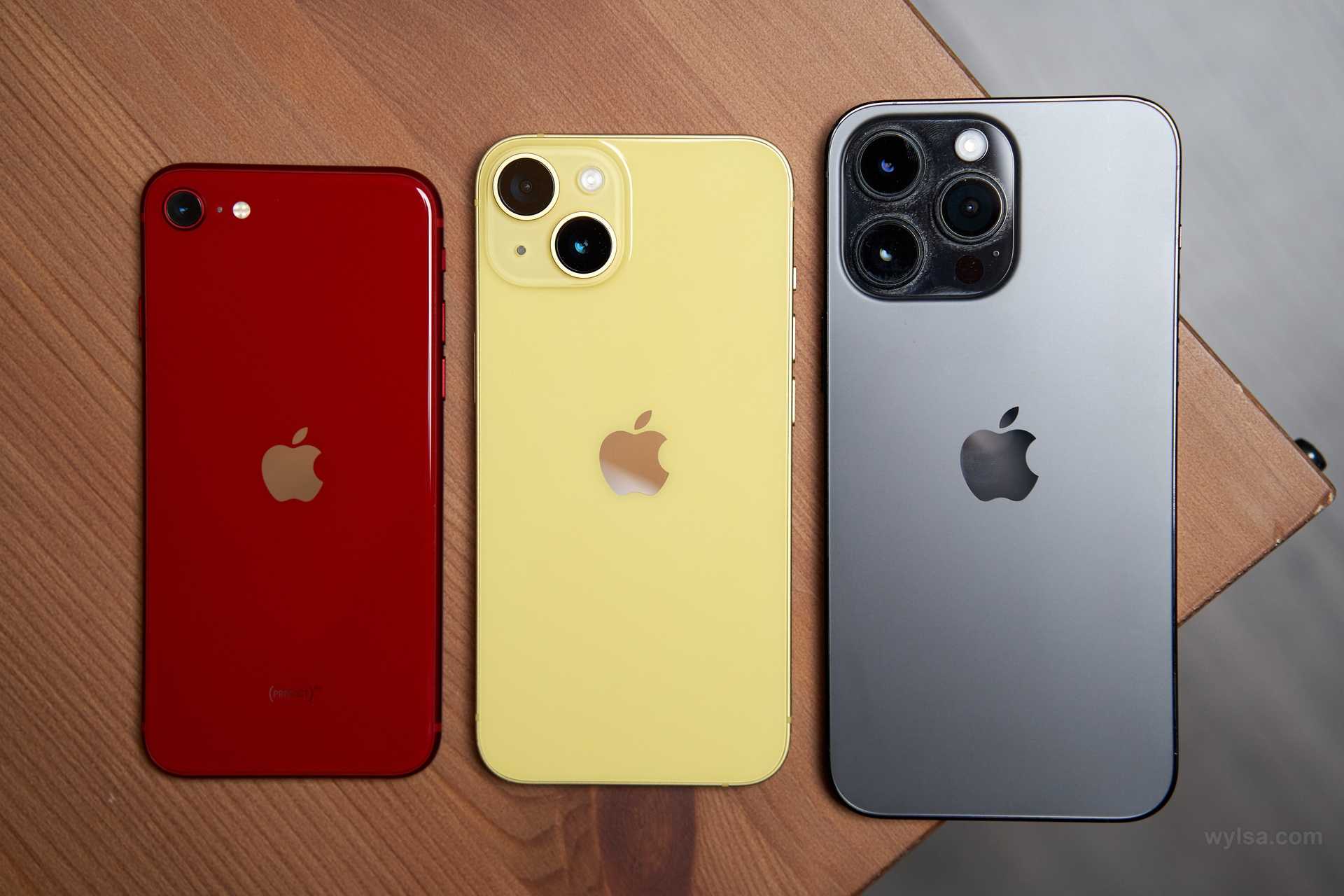 iPhone SE 2022 на фоне современных iPhone 14 и iPhone 14 Pro Max просто миниатюрный. Фото: Александр Побыванец / Wylsacom Media
