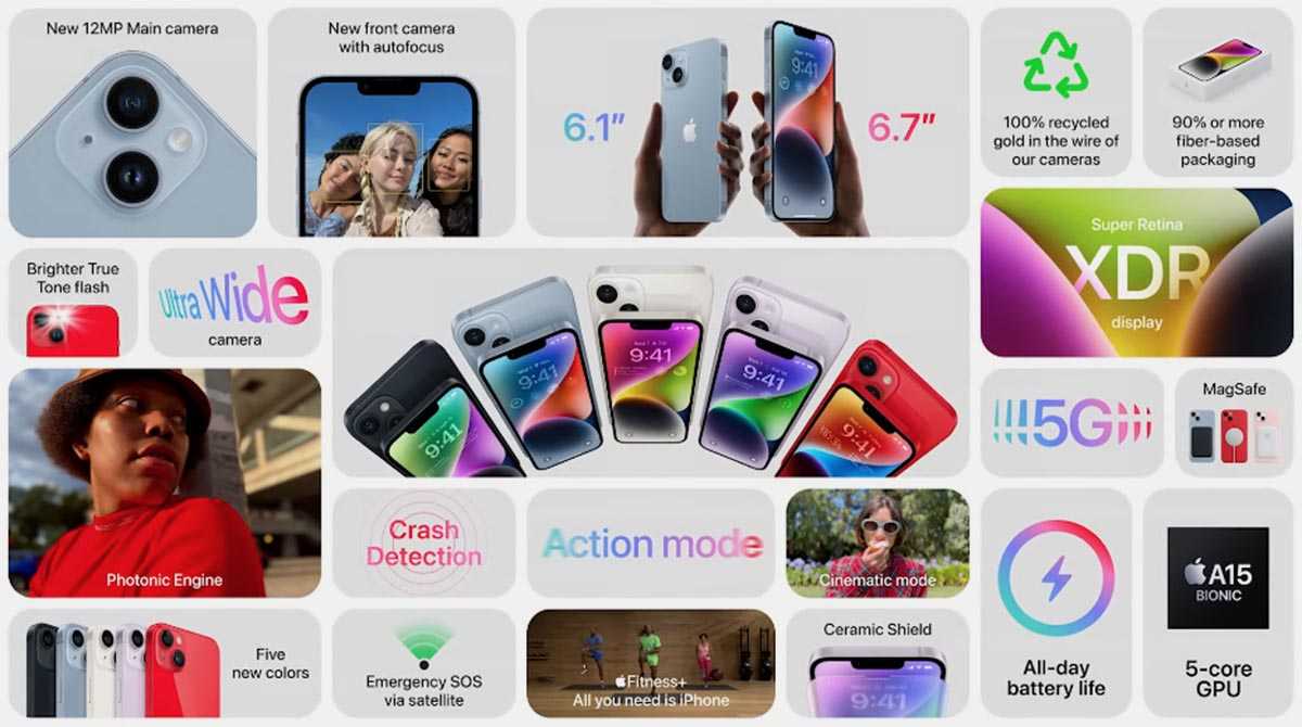 Линейка iPhone 14 работает под управлением прошлогоднего 5-нанометрового чипа A15 Bionic. На борту 5-ядер GPU и 16-ядерная система Neural Engine. Благодаря улучшенной компоновке элементов и увеличенному объему ОЗУ (6 ГБ вместо 4 ГБ у iPhone 13) гаджет будет производительней своего предшественника, но не на много.