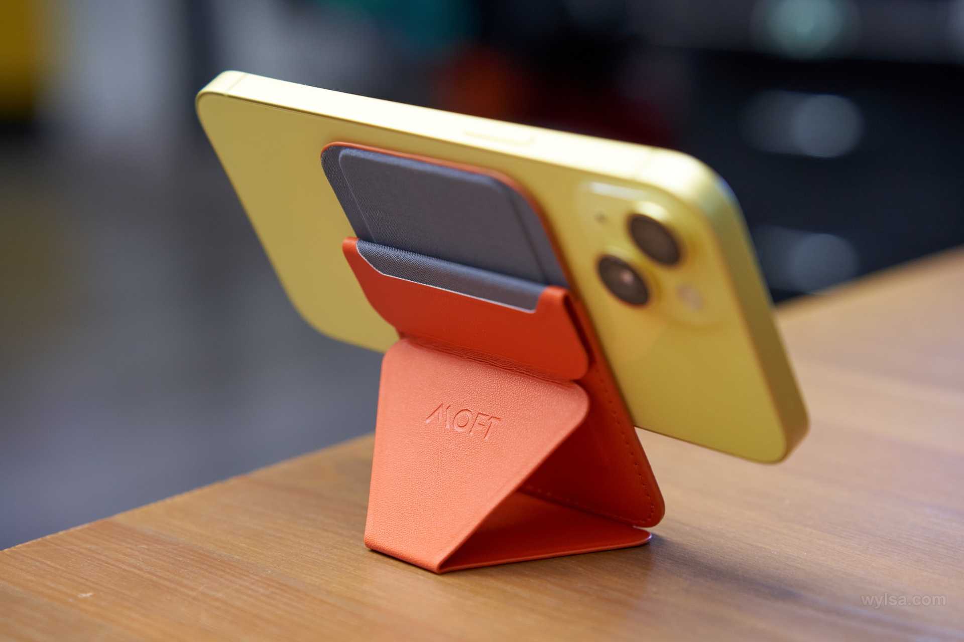 Зато нашёл удобный аналог у Moft. Кошелёк тоже крепится через MagSafe, держится очень плотно и уверенно. В него помещаются 2 карты, можно и 3 запихнуть, но тогда вынимать придётся с большими усилиями. Вдобавок кошелёк ещё и в роли подставки работает. Очень удобно во время поездок с ребёнком, показываешь дочке мультфильмы, закрепив телефон.