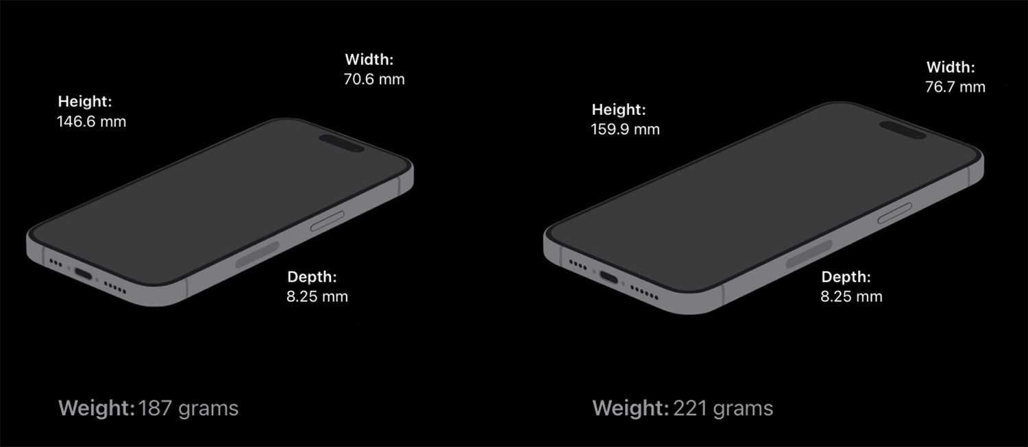 iPhone 15 Pro – 146.6 х 70.6 x 8.25 мм, вес187 гр;iPhone 15 Pro Max — 159.9 х 76.7 x 8.25 мм, вес 221 гр.