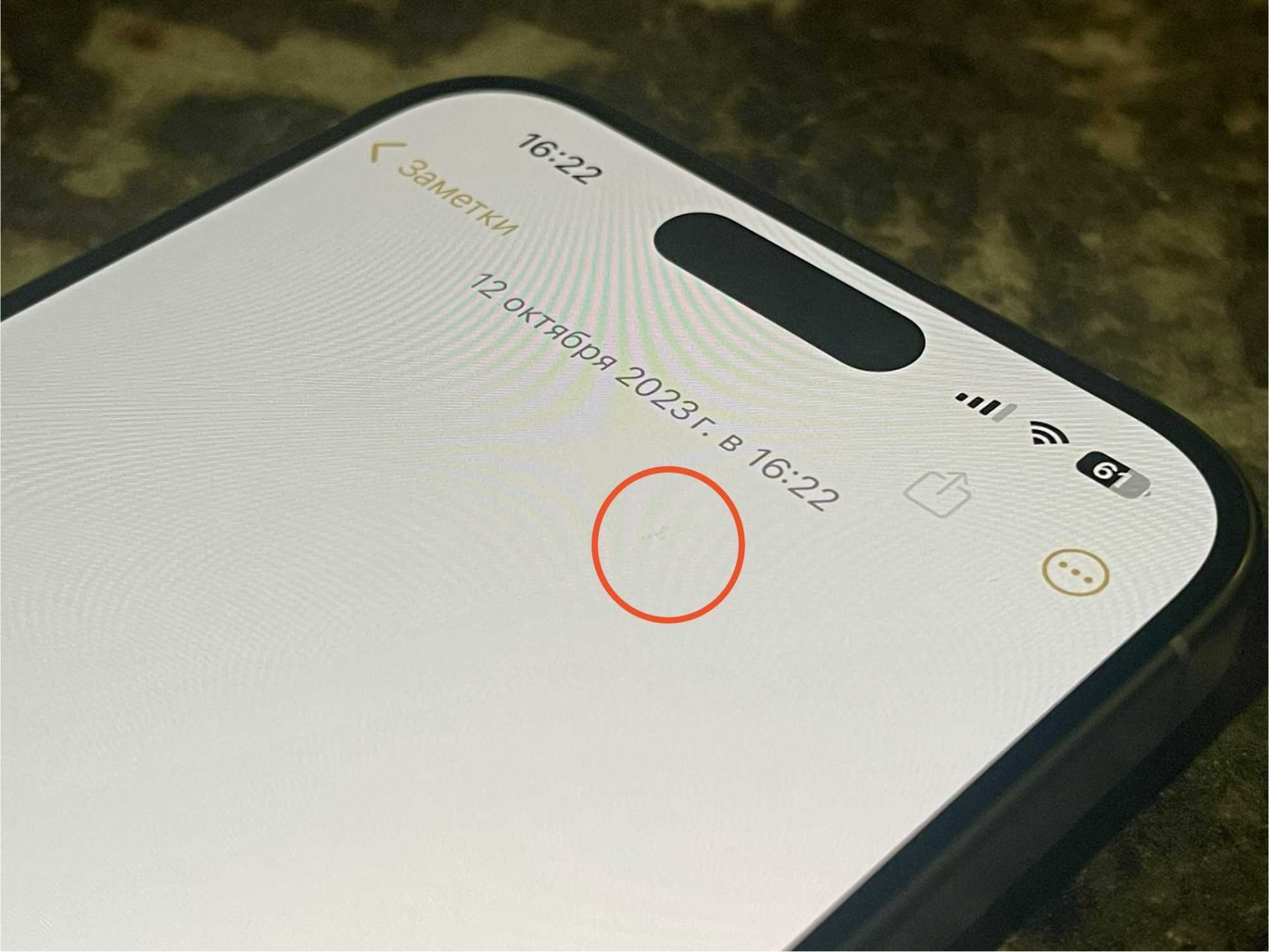 При этом первые царапины на дисплее iPhone 14 Pro у меня начали появляться лишь через полгода использования. Здесь ситуация иная. Две недели — мелкая царапина на экране. Её почти не видно, но она есть. Откуда появилась, ума не приложу.