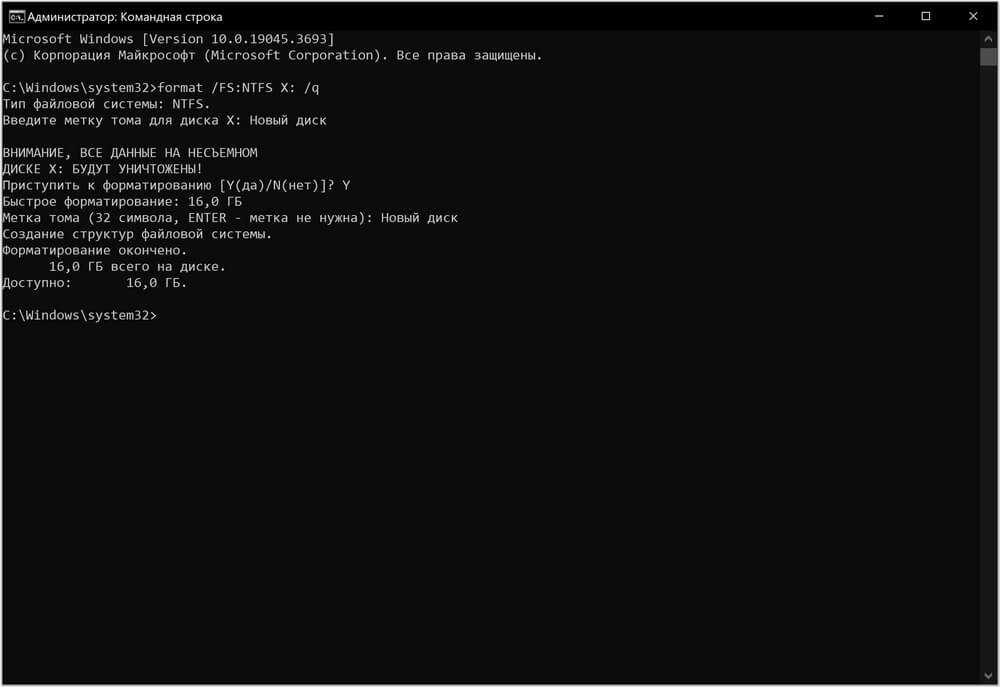 - перед вами откроется привычная командная строка, с помощью которой можно форматировать разделы диска, используя команды format z: /FS:NTFS, где z – ваш диск, а NTFS – файловая система.
