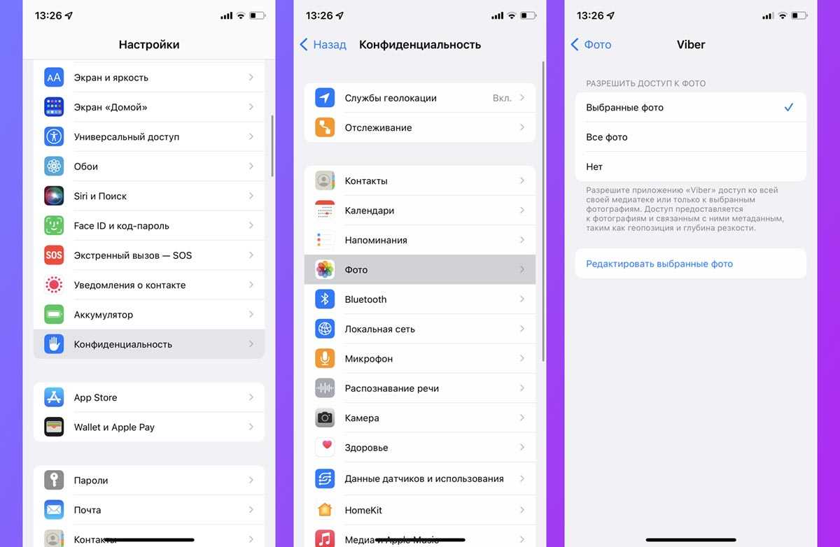 Такой параметр задается по пути Настройки – Конфиденциальность – Фото. Сначала запретите доступ к галерее для большинства приложений, а затем выдайте некоторым программам доступ только к выбранным снимкам.