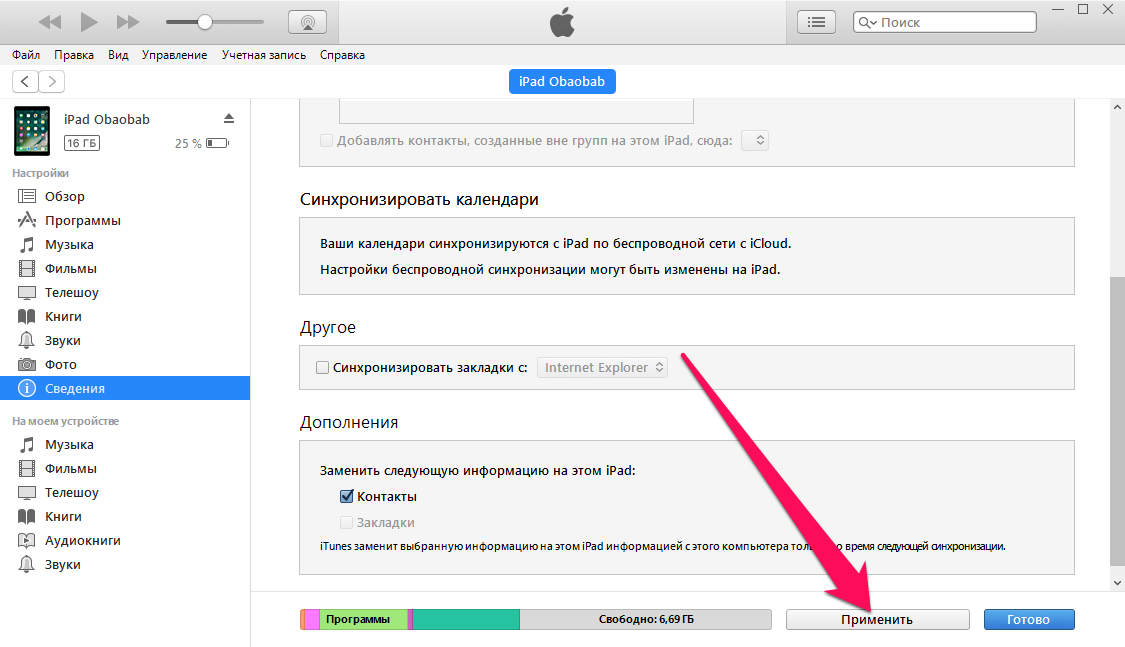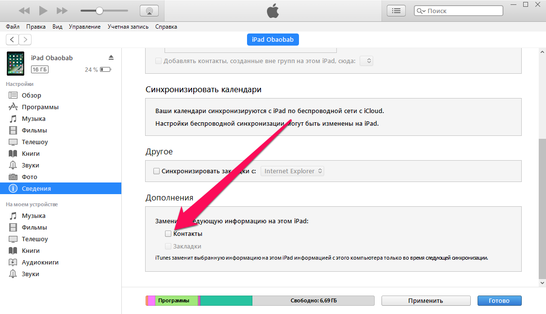 Важно! iTunes заменит существующие записи в новом устройстве. Заранее позаботьтесь о перемещении важных контактов