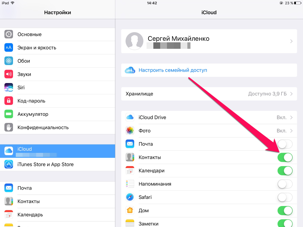 - Активируйте данные для синхронизации (в нашем случае — контакты).