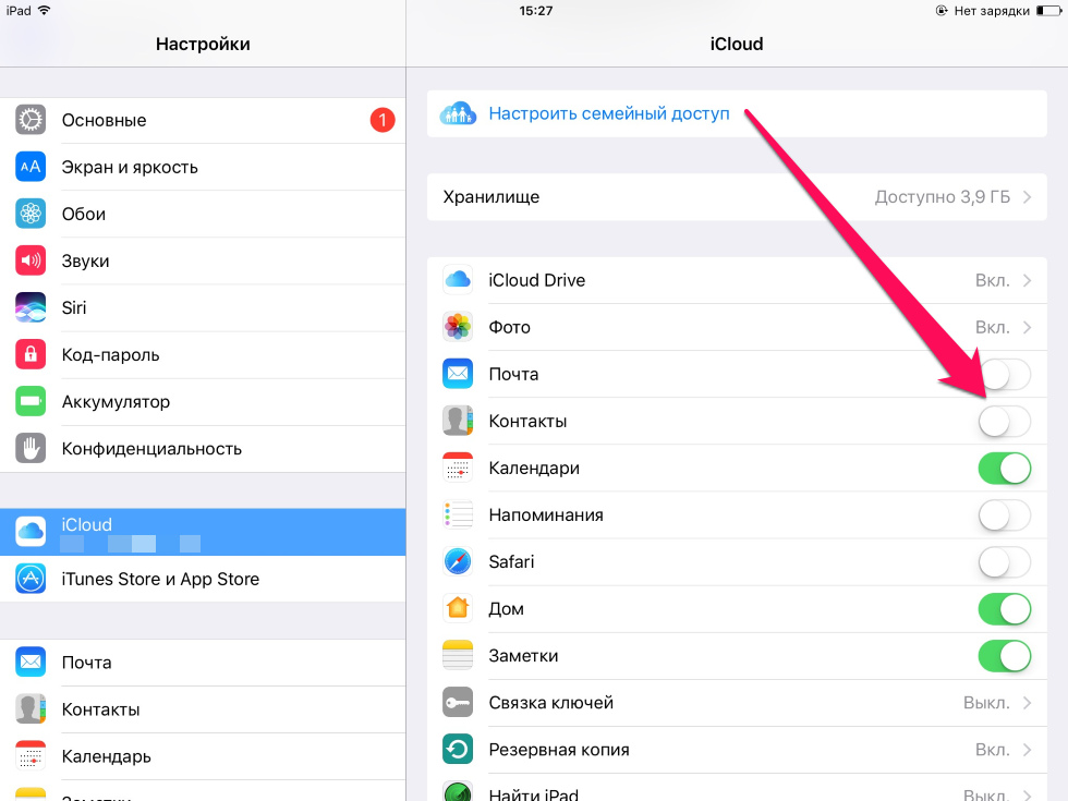 - для этого заходим в «Настройки», тапаем по вкладке iCloud, в открывшемся меню ищем пункт «Контакты» и ставим бегунок напротив него в активное положение («Вкл»);