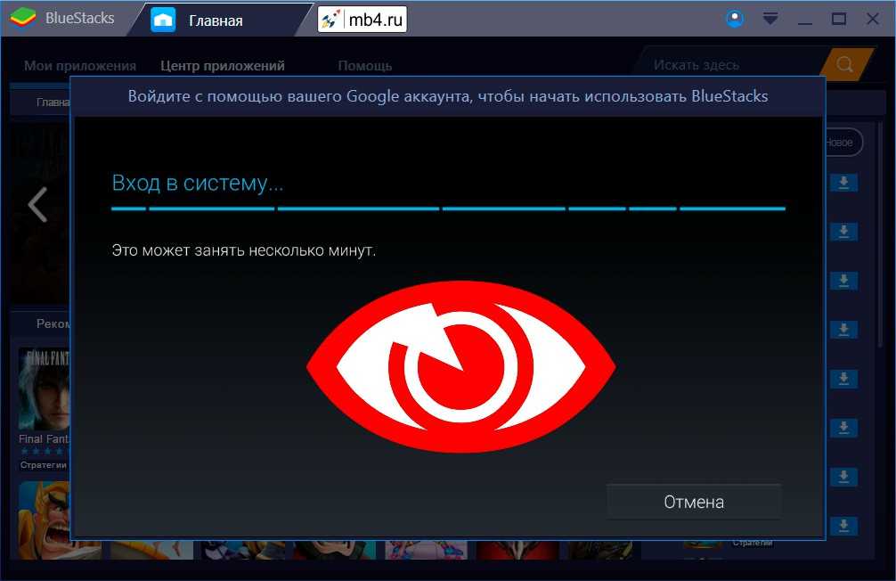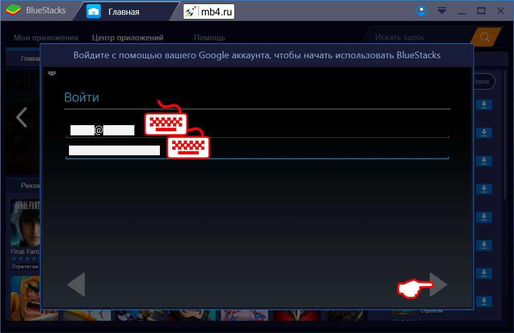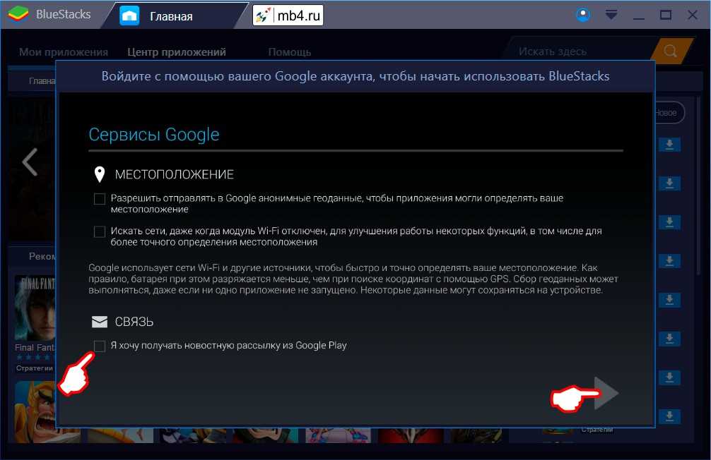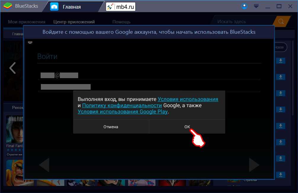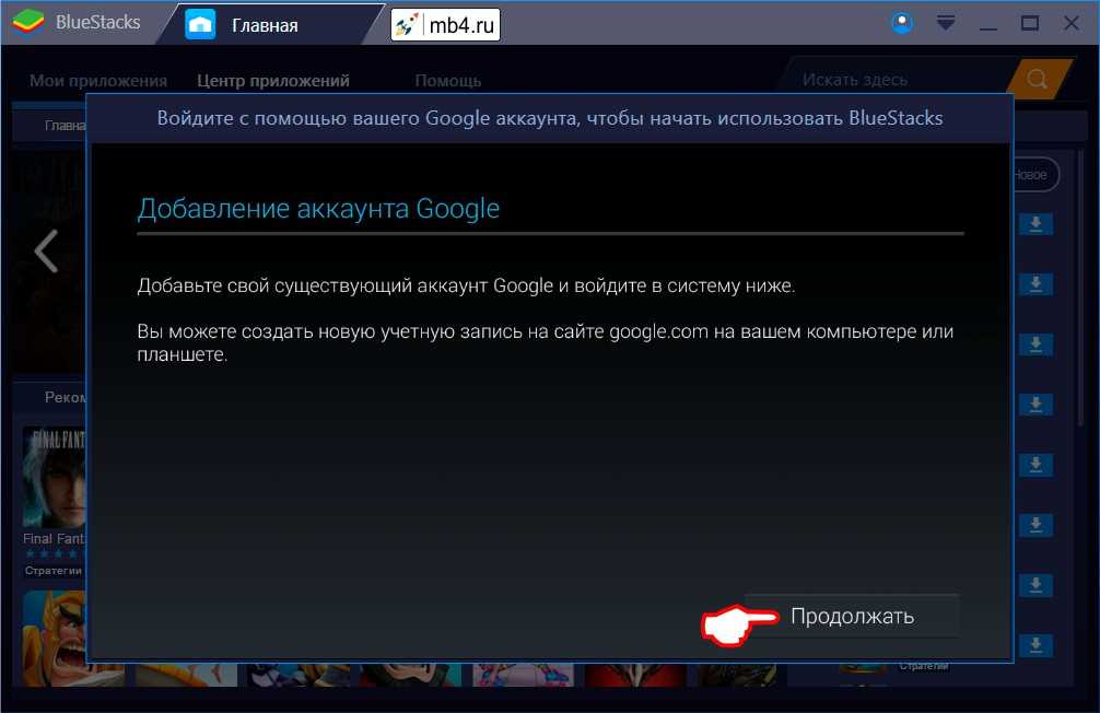 BlueStacks запустится автоматически. В первый раз вам следует авторизоваться с помощью Google-аккаунта. Для этого: