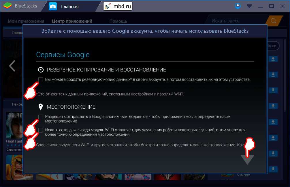 1. Для того, чтобы создать новый аккаунт в BlueStacks, запускаем эмулятор. Программа попросит вас внести первоначальные настройки. На этом этапе включается поддержка AppStore, подключаются различные сервисы и настройки. Имеется возможность создать резервную копию и получать рассылку при желании.
