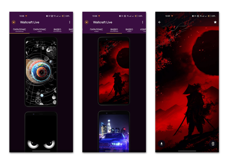 В бесплатном приложении для Android Live 3D предусматривается обширная библиотека обычных и живых обоев для мобильных устройств. Все изображения довольно высокого качества, а немалое количество скачиваний и положительных отзывов в официальном магазине Google Play говорят о том, что приложение довольно популярное за счет простоты использования, большого количества оригинальных и уникальных 3D-обоев для рабочего стола и других преимуществ. Интерфейс на русском языке, поэтому разобраться в возможностях не сложно. А их, в свою очередь, не слишком много, но все необходимые инструменты для просмотра и скачивания изображения есть.