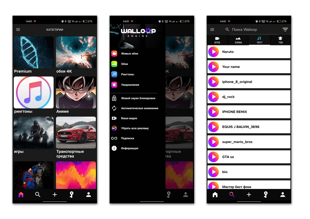 Еще одно многофункциональное приложение, располагающее большим количеством статических фонов, живых обоев, рингтонов, мелодий для уведомлений. Что касается анимированных изображений, то большинство их них потребуется приобретать за внутреннюю валюту — ключи, которые покупаются отдельно или зарабатываются посредством просмотра рекламы. Пожалуй, этот недостаток свойственен большинству подобных приложений, но при этом здесь более 8000 видеообоев, около 24000 фонов и 1700 различных звуковых мелодий.