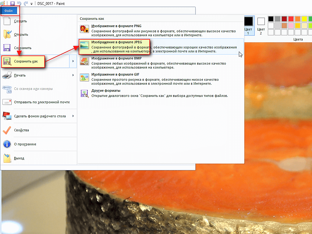 Это также просто, как и в предыдущем редакторе. Да и названия у них созвучны. Вот, посмотрите на изображении ниже, достаточно одной картинки, чтобы отобразить весь нехитрый способ как изменить формат фотографии.
