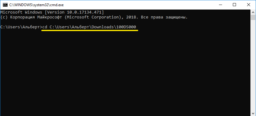 Вставляем в строку путь к папке, в которой расположены файлы, сразу после команды cd, выглядит это так: cd C:UsersАльбертDownloads100D5000, (у Вас путь будет свой, поэтому я зачеркнул мой, чтобы случайно не скопировали).