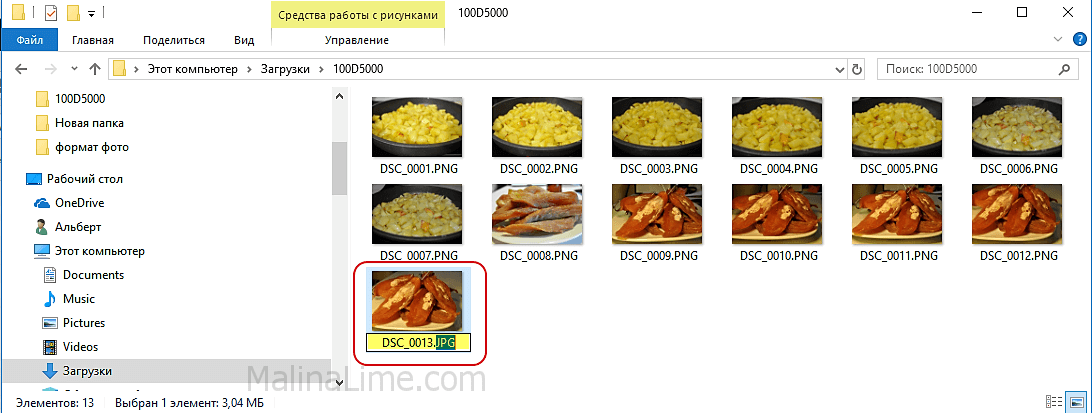 - Найдите файл. Для графических файлов можно изменить расширение вручную, изменив имя файла с помощью клавиатуры. Это правильное решение, если из-за текущего расширения файла нельзя получить доступ к его содержимому (выводится сообщение об ошибке «неверный формат файла»):