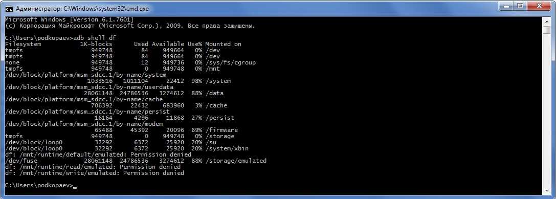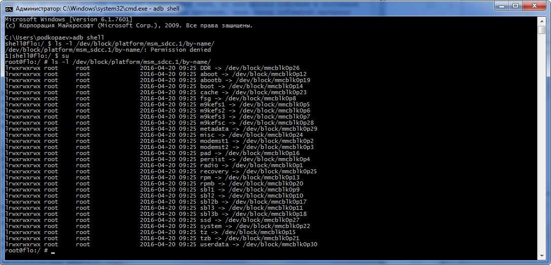 В консоли появляется знак $ (далее по тексту этот знак будет означать необходимость ввода предварительной команды adb shell), и после этого можно вводить серию команд, получая после каждой отклик. Второй способ — если необходимо ввести только одну команду, можно писать ее подряд за adb shell.