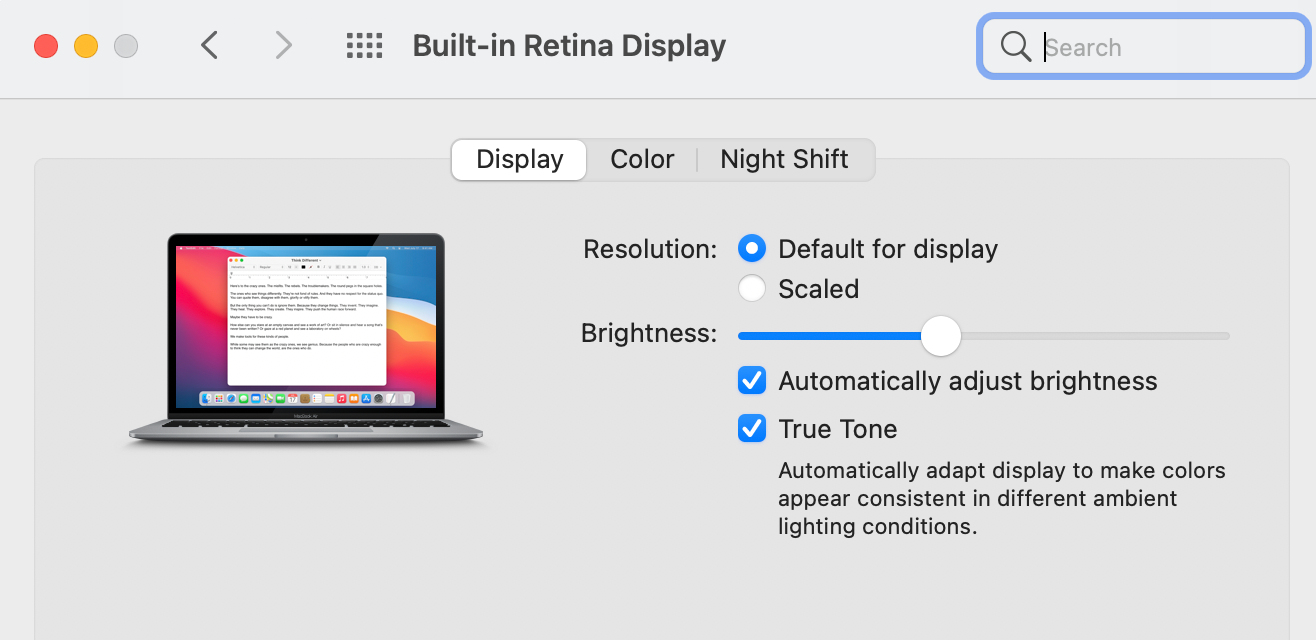 Установите флажок « Автоматически настраивать яркость», чтобы ваш Mac мог адаптировать яркость экрана в соответствии с окружающим освещением, и включите True Tone, чтобы разрешить ему изменять цветовую температуру дисплея. Активируйте Night Shift, чтобы сделать цвета экрана более теплыми в ночное время. Это также может помочь вам лучше спать.