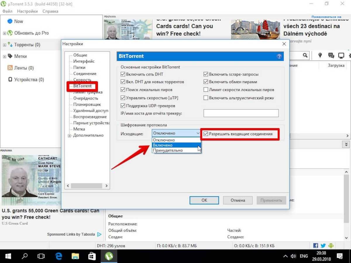 С помощью шифрования протокола снимается лимитирование скачивания, устанавливаемого провайдером при включении большого количества закачек через торрент-клиенты. Для его включения нужно зайти в настройки, выбрать слева «Bittorrent», а справа, в разделе «Шифрование протокола» выставить «Включено» на исходящих и поставить галочку рядом с «Разрешить входящие соединения».