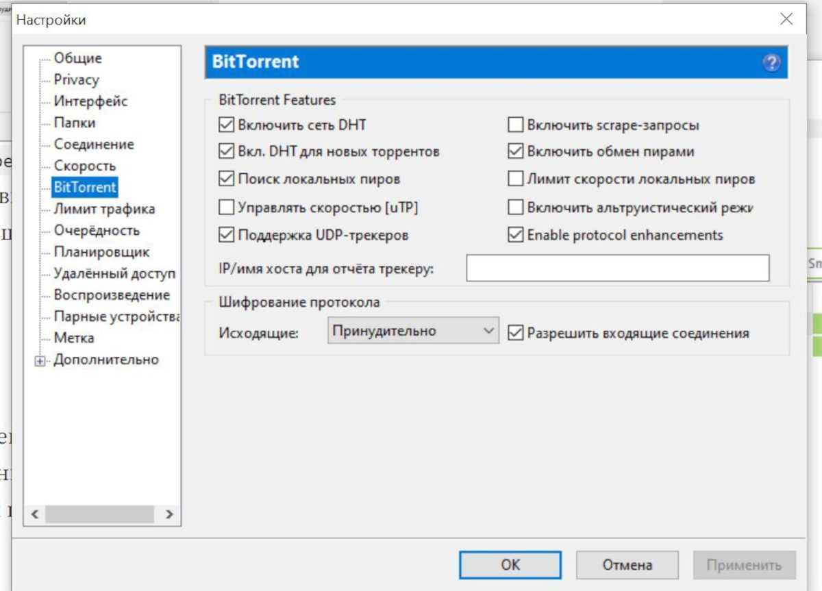 Откройте вкладку «BitTorrent» и отключите лимит скорости локальных пиров (если он включен), а также обратите внимание на строку «Шифрование протокола». Проверьте, изменяется ли скорость в зависимости от того, отключили вы данную опцию или нет.