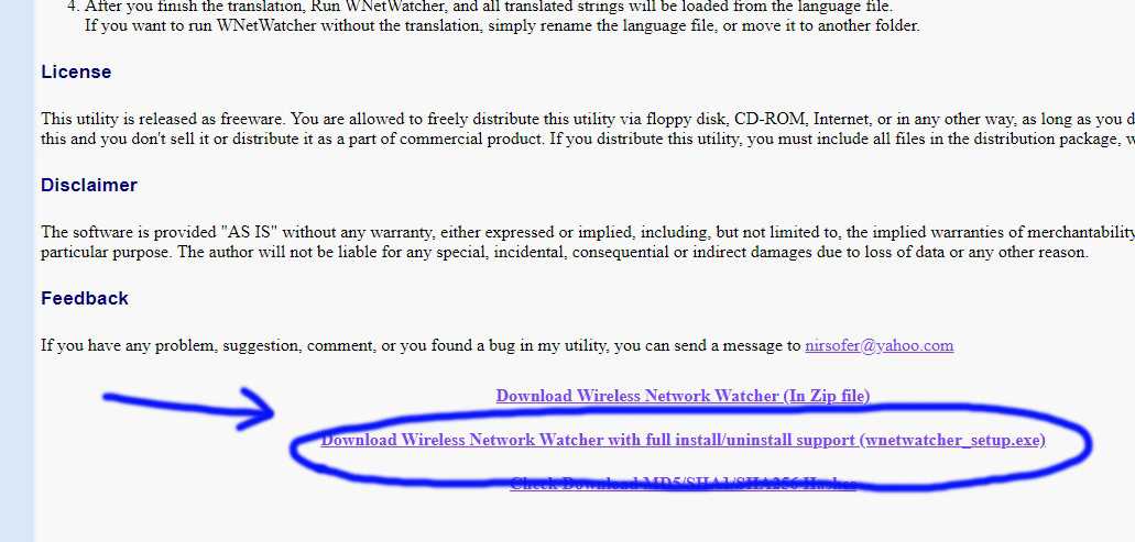 Чтобы загрузить инсталлятор, необходимо кликнуть на строку «Download Wireless Network Watcher with full install/uninstall support (wnetwatcher_setup.exe)», расположенную внизу страницы.