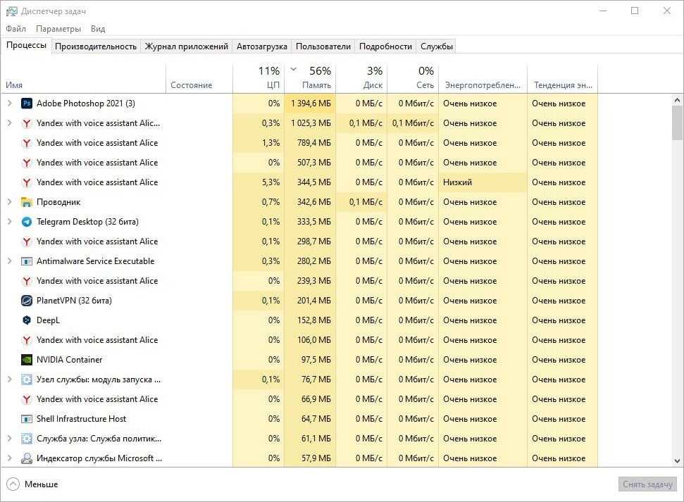 Еще один способ, как посмотреть характеристики компьютера — заглянуть в диспетчер задач. Да, в нем можно не только прервать ненужные процессы и закрыть зависшие программы, а узнать информацию о состоянии процессора, видеокарты, ОЗУ и жесткого диска.