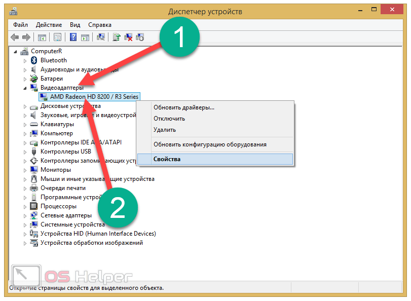 1. В меню Пуск напечатайте диспетчер устройств и запустите приложение. Разверните ветку «Видеоадаптеры».
