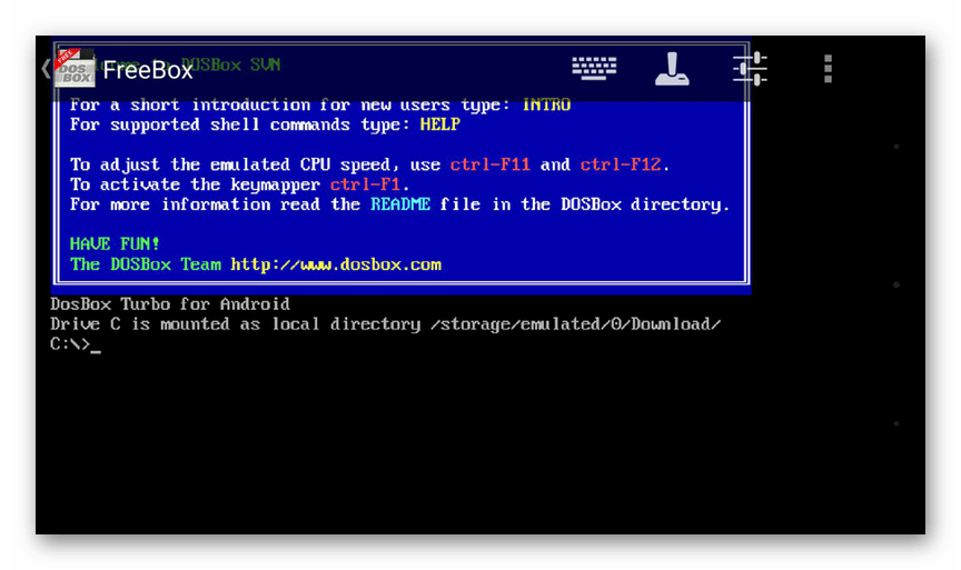 Этот вариант эмулятора, как видно из названия, предназначен не для развертывания Виндовс, а для запуска DOS-приложений на телефоне. Данное ПО отлично справляется с обработкой файлов, практически не имеет проблем с производительностью даже на относительно слабых смартфонах и обладает сравнительно небольшим весом.