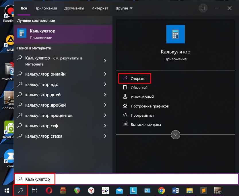 В строке поиска введите calc (или зайдите в меню “Пуск” и во всех приложения найдите “Калькулятор”) => нажмите на “Калькулятор” правой клавишей мыши => чтобы закрепить в меню “Пуск” – нажмите на “Закрепить на начальном экране”, чтобы закрепить в панели задач – нажмите на “Закрепить на панели задач”.