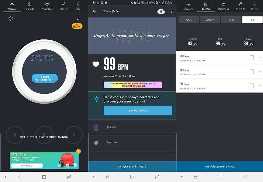 Способ измерения и сохранения данных о частоте сердечных сокращений аналогичен описанному выше приложению, удерживая палец на камере вашего устройства. Но здесь вы должны нажать кнопку измерения, прежде чем сделать это. Кроме того, вы можете отслеживать свои тренировки, пищевые привычки и искать полезные рецепты. И его также можно подключить к Google Fit для более эффективной синхронизации данных.