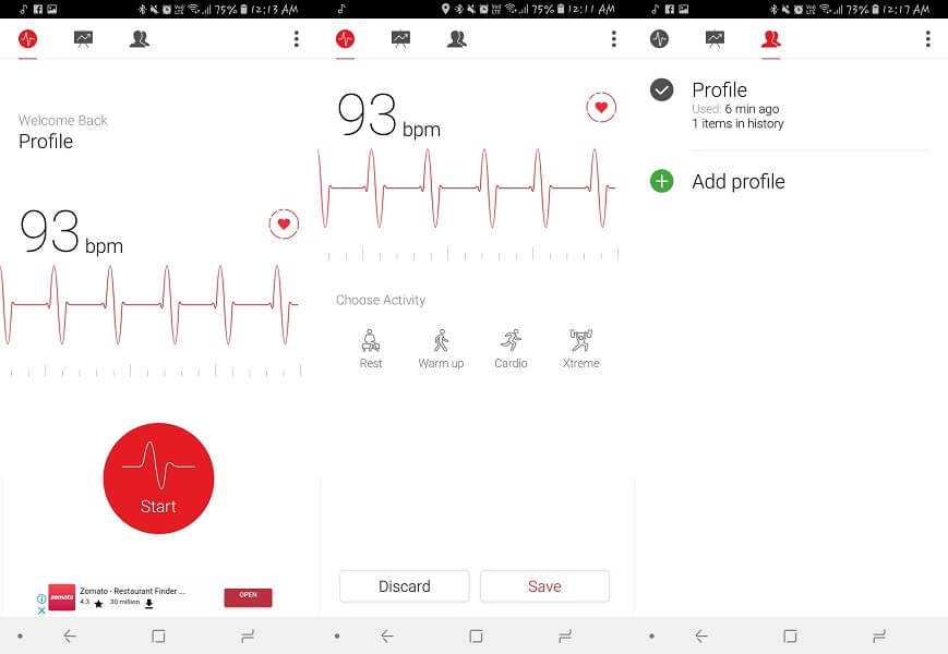 Хотя и спереди, результат не всегда точен, и иногда трудно правильно расположить палец. Результаты будут отображаться в цветном индикаторе, чтобы вы могли легко отличить, хорошо это или плохо. Вы можете сохранить данные своего пульса и добавить активность, которую вы делали в это время, чтобы иметь более подробные записи. Вы можете добавить несколько профилей, чтобы сохранить данные о частоте сердечных сокращений более чем одного человека.