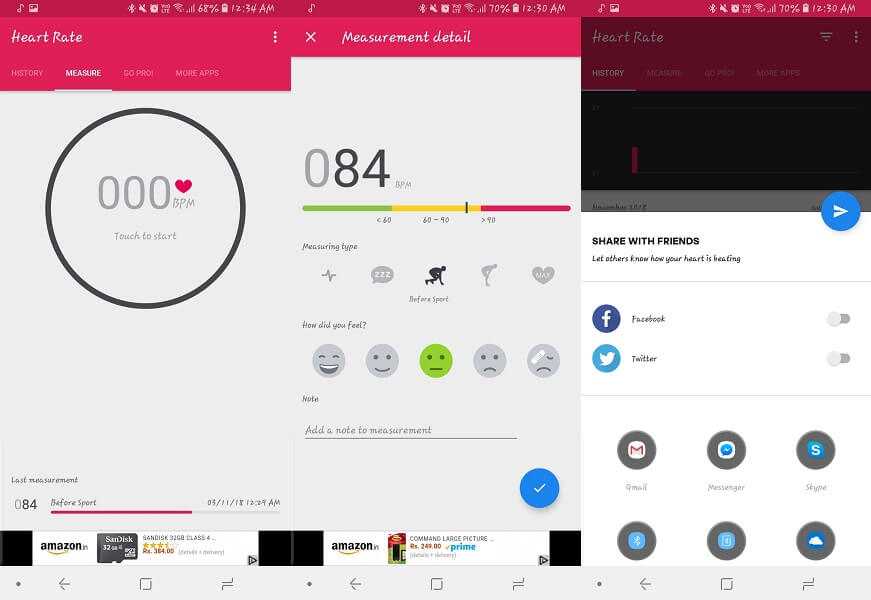 В отличие от вышеупомянутых приложений, в этом вам нужно не только держать палец на камере, но и закрывать вспышку, чтобы иметь более точные и мгновенные измерения сердечного ритма. Вы получите учебник о том, как это сделать при запуске приложения. Это также позволяет сохранять измерения с типом активности и настроением, которые у вас есть, которые позже можно проверить. история. Этими измерениями можно поделиться с друзьями через несколько социальных сетей.