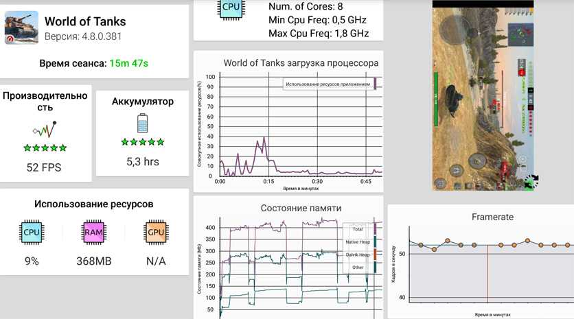Кстати, об играх. В Wоrld of Tаnks: Blitz девайс выдал 50 fps на максимальных настройках графики без значительного нагрева и троттлинга. На минимальных настройках частота кадров держится почти к 60 fps.