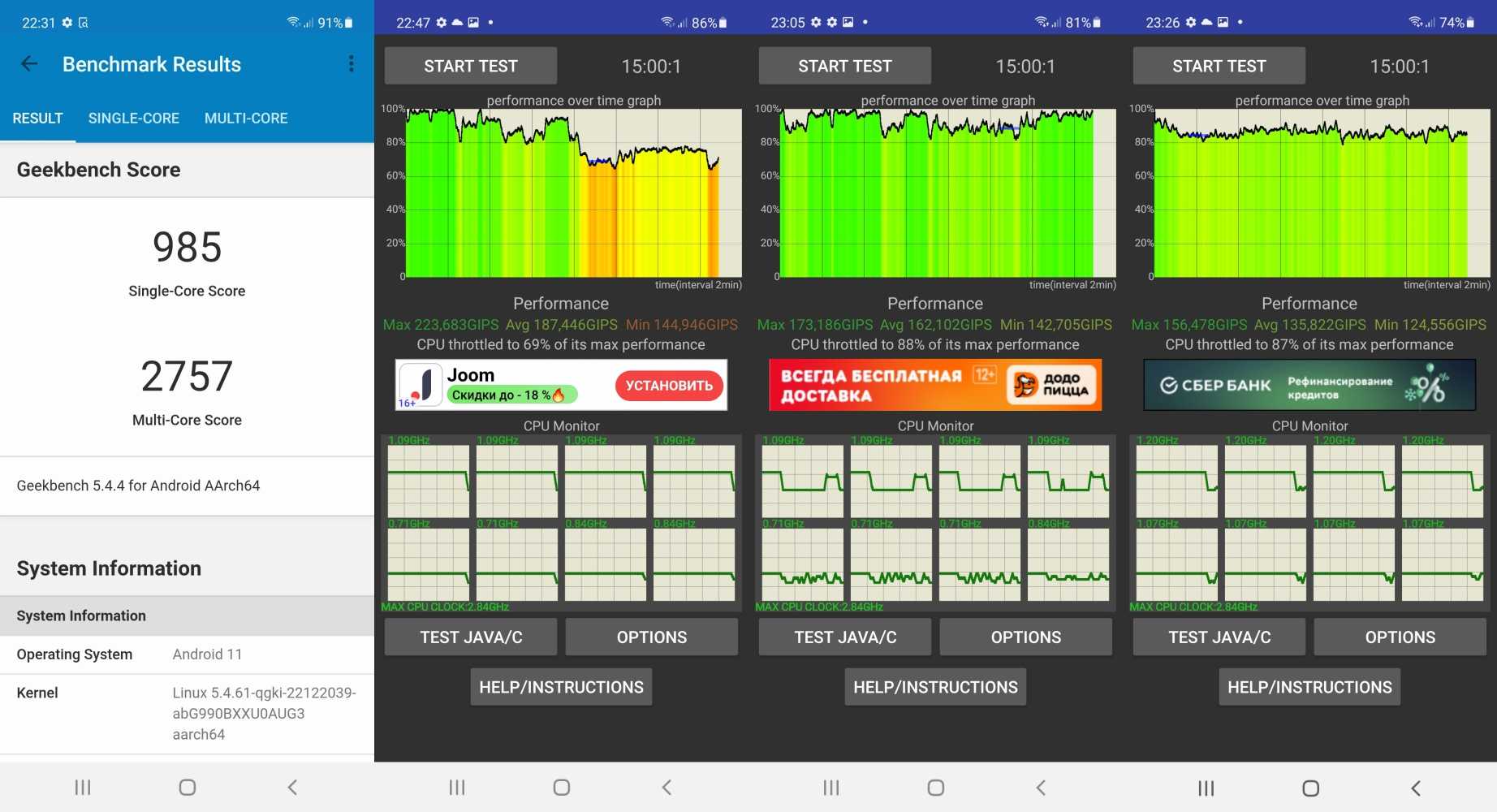 В отличие от Galaxy S21 с чипсетом Exynos, у Galaxy S21 FE процессор Snapdragon 888, печально известный повышенным температурным выделением. Это и доказывают бенчмарки: после четырёх сессий на троттлинг результаты удручающие. Но этим поведением он не отличается от коллег с таким же «тремя восьмёрками».