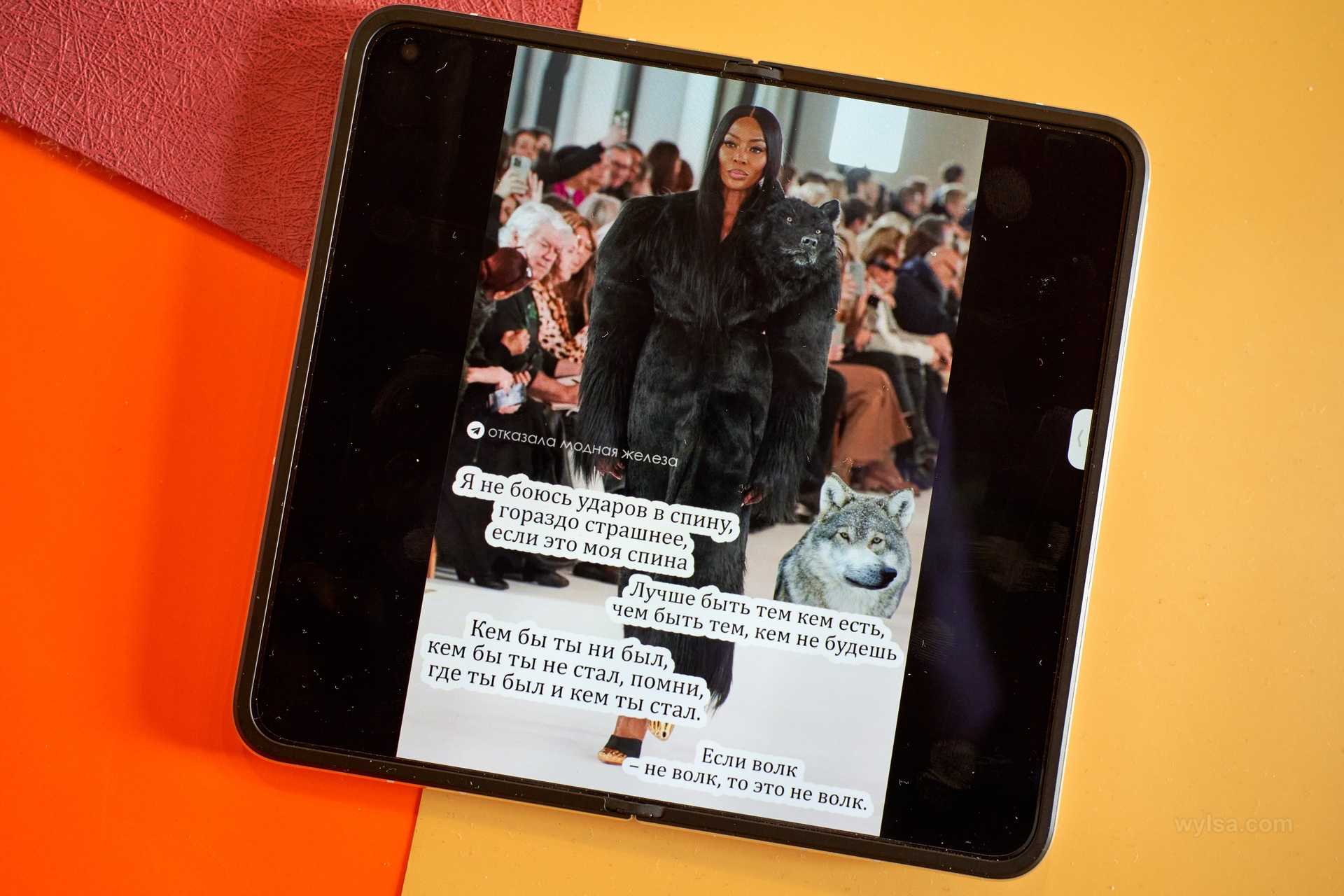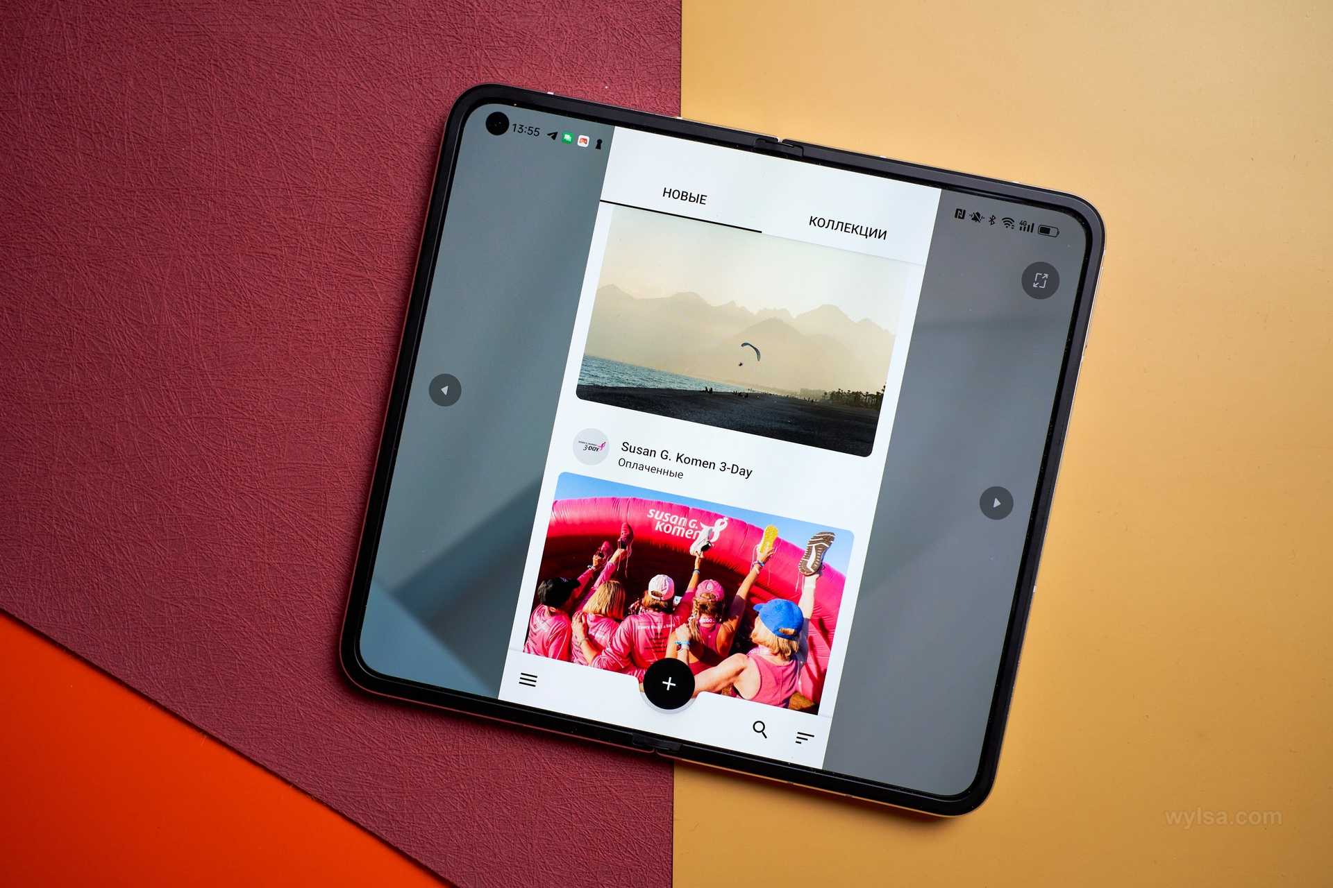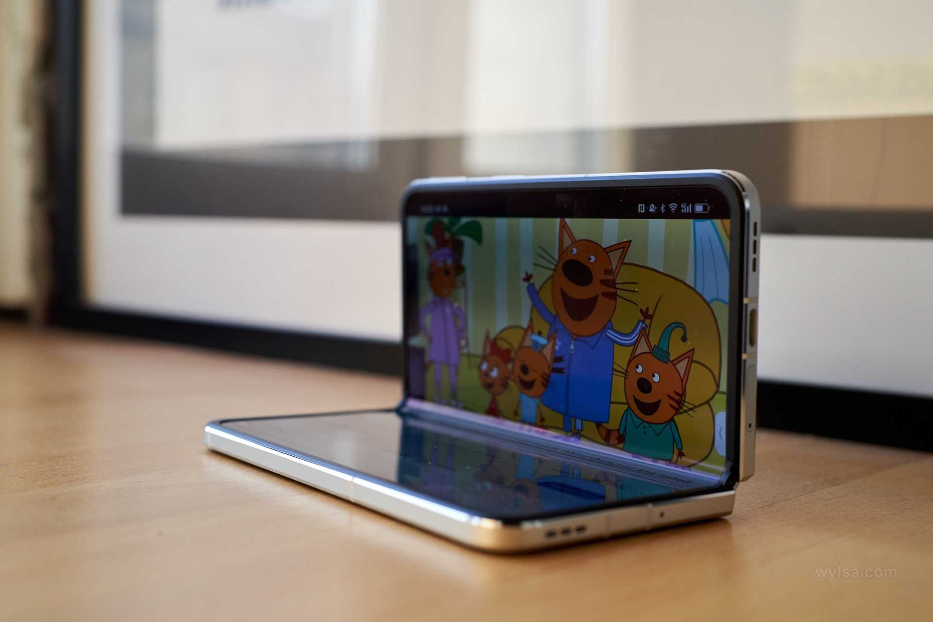 Оба экрана отличного качества: яркие, сочные, с поддержкой 120 Гц. Изображение отличное, дисплеи что надо — всё на уровне. На большом дисплее удобно читать, рассматривать фотографии, играть или смотреть видео. С кино, конечно, есть неприятный нюанс в виде неизбежных чёрных полос во время просмотра. Но это уже не проблема смартфона, а особенность всех дисплеев такого формата.