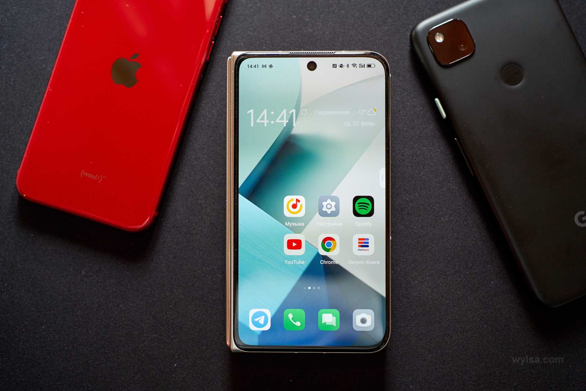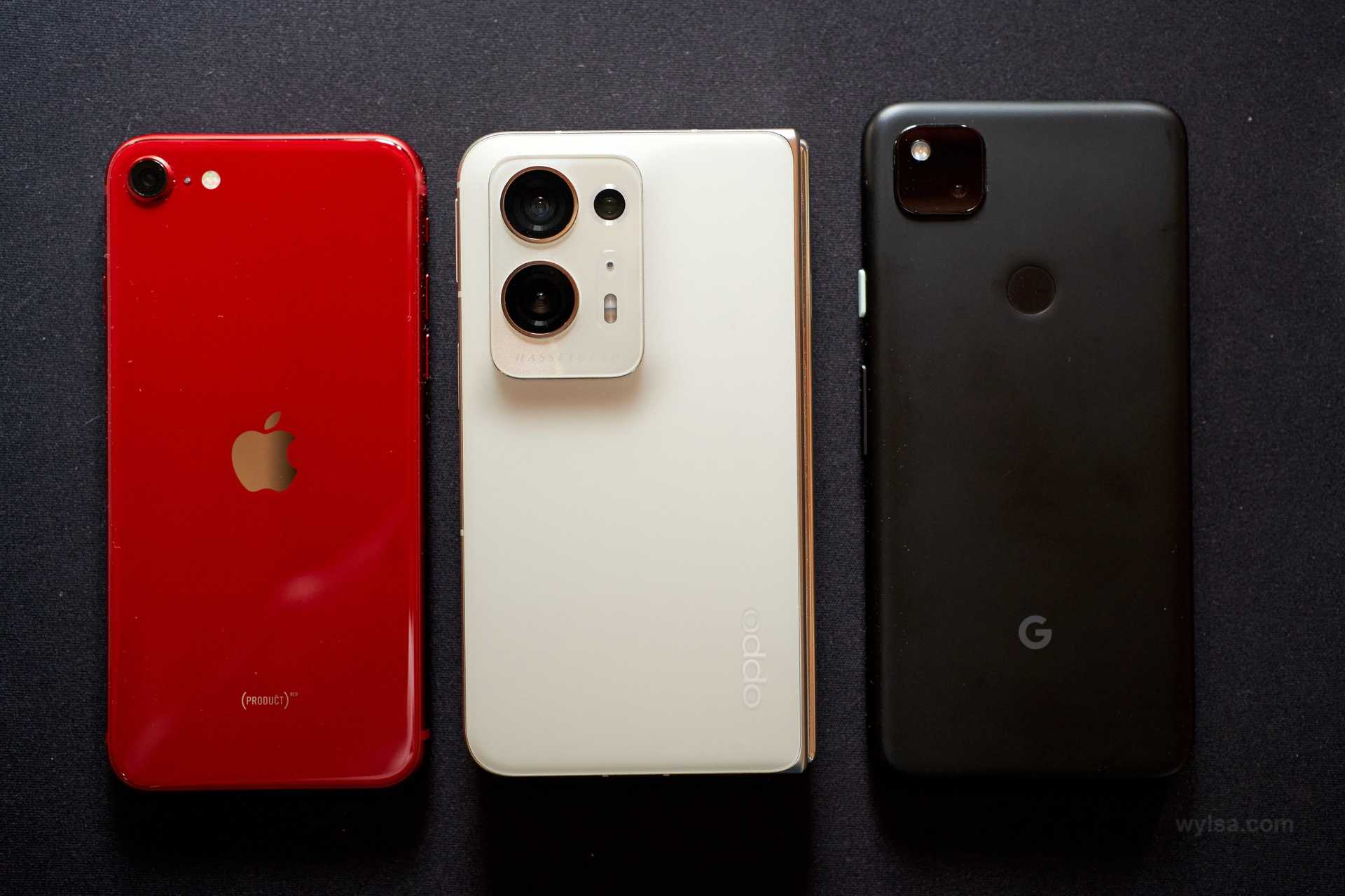 Если абстрагироваться от толщины, то смартфон небольшой. Слева направо: iPhone SE (2022), OPPO Find N2, Google Pixel 4a