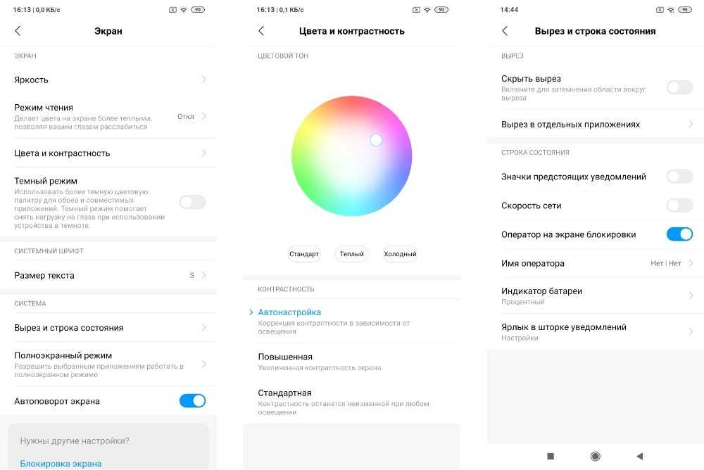 Также отмечу большой набор настроек экрана, доступных пользователю в базовых параметрах. Имеется возможность регулировки цветовой температуры дисплея, сделав его более теплым или холодным, гибкого изменения контрастности и специальный режим для чтения. Последний режим разработан Xiaomi совместно с концерном Tüv Rheinland, который протестировал и сертифицировал функцию.